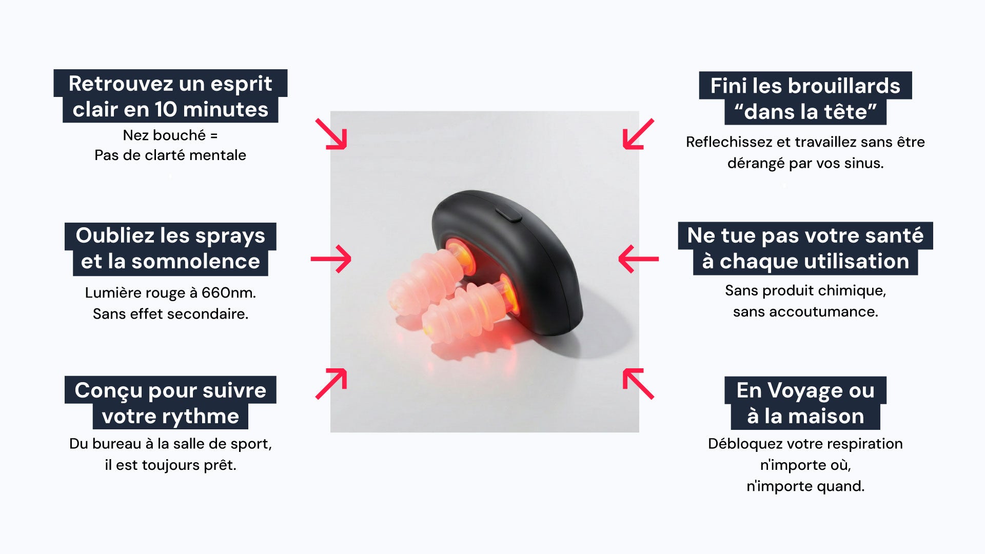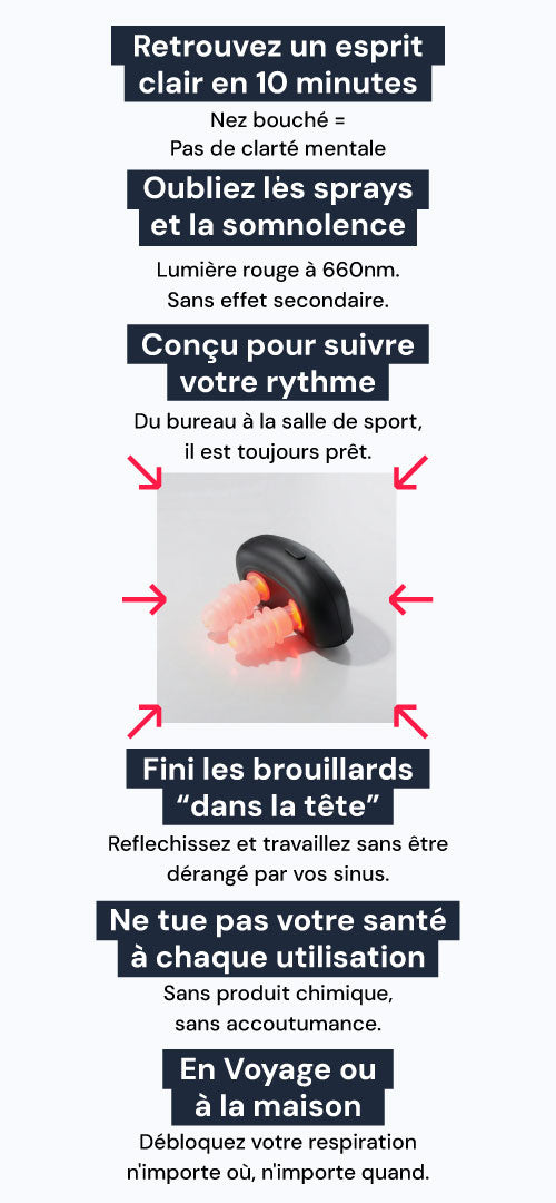 Il utilise une lumière rouge calibrée à 660nm pour apaiser en douceur l'irritation nasale. Résultat : votre respiration est libérée, naturellement et sans produits chimiques.